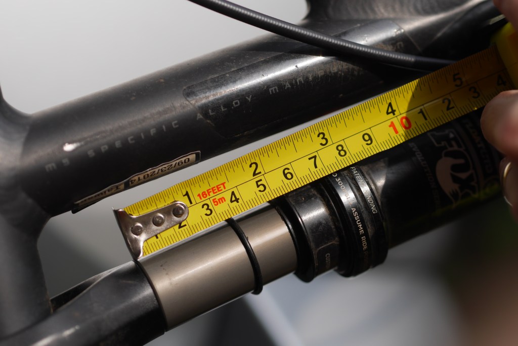 Je roule aux sentiers du moulin (pente moyenne de 5.77 degrés) et mon vélo (Forbidden Druid Large) à un empattement de 122,1 cm. Il devrait donc avoir une différence de hauteur de 12,3 cm entre l’axe avant et arrière de mon vélo.