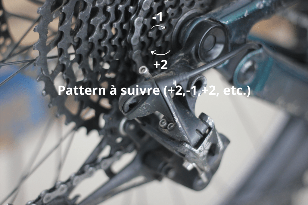 C’est super important pour éviter de faire un changement dans le haut de ta cassette qui va te nuire dans le bas. - Refais le processus No.3 en montant 2 vitesses, puis en descendant 1, en remonter 2, redescendre 1, …