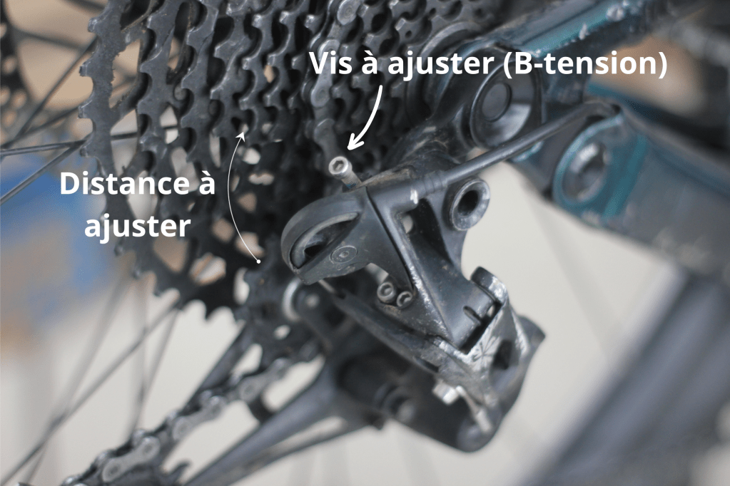 L’objectif c’est de rapprocher le plus possible le galet du haut de ton dérailleur (c’est lui qui change ta chaine de place) de ta cassette sans générer de friction excessive.