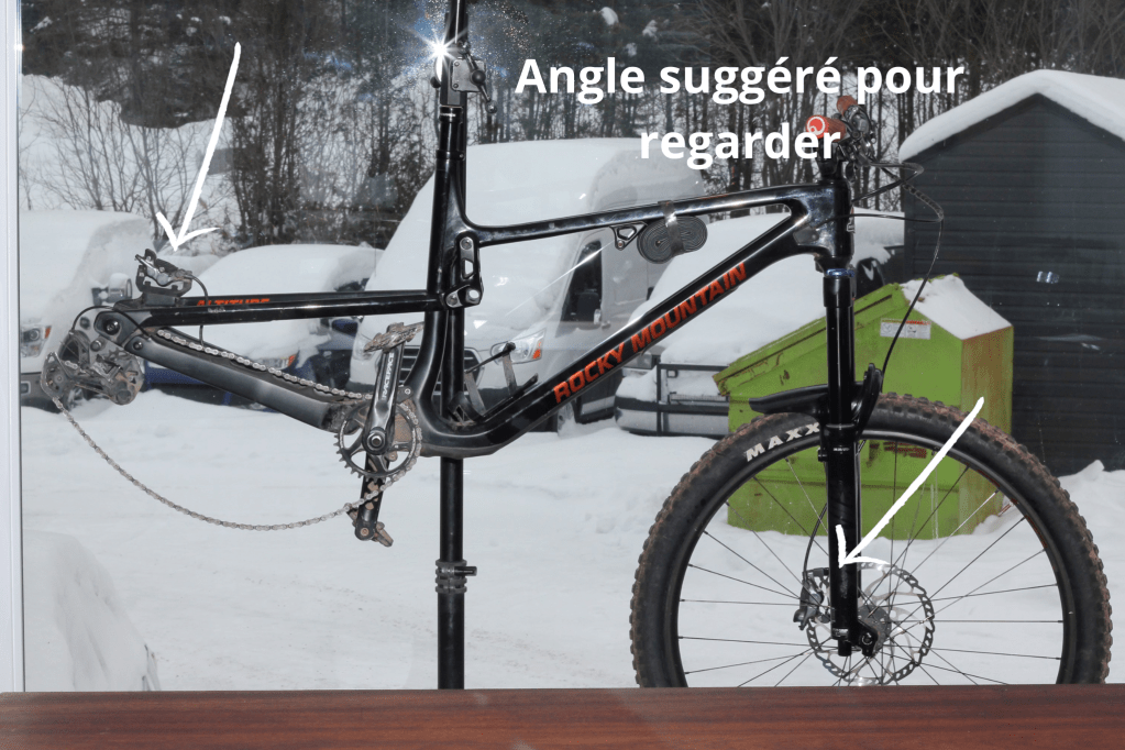 - Installe-toi dans une position où tu peux voir l’avant et l’arrière de tes plaquettes: il faut que tu puisses voir quels côtés frottent, mais aussi si tu dois ajuster la vis du haut ou du bas de ton étrier.