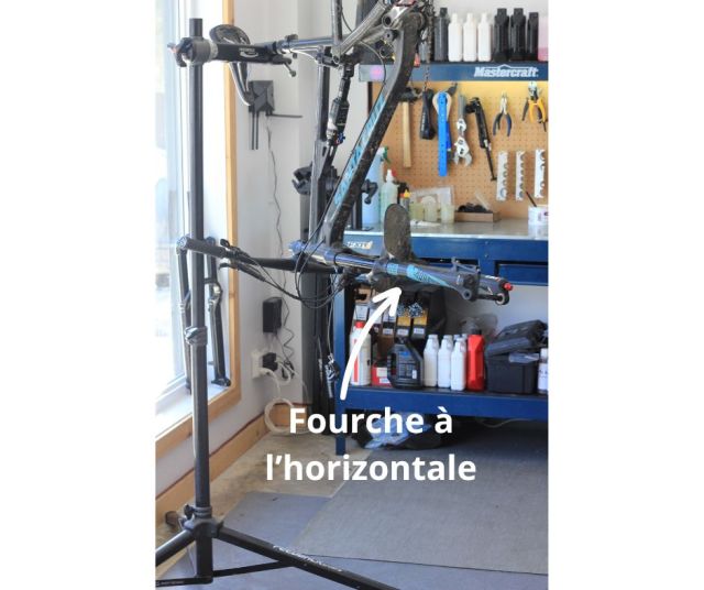 Place ton vélo dans le stand de façon à que ta fourche soit à l’horizontale. Ça va éviter que l’huile sorte et coule durant le démontage.
