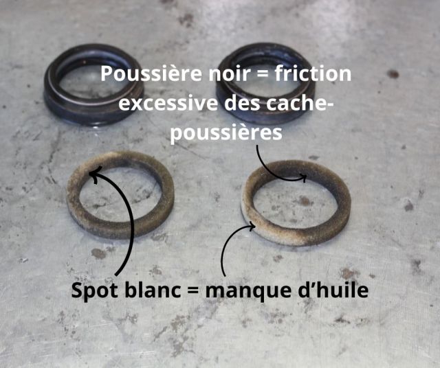 Il y a aussi des huiles de lubrification qui gardent le niveau de friction pas trop élevé et que tu perds au fur et à mesure que tu utilises tes suspensions (c’est normal).
