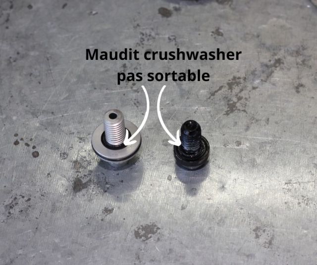 Avant d’installer les vis/écroux, il faut remplacer les crush washer. C’est les petits ronds en plastique qui se déforme lorsque tu serres les vis/écroux pour sceller les lowers. Particulièrement chez Rockshox, ça peut être un défi de les sortir: ils sont comme enfoncés dans la tête de la vis et ben pris là.