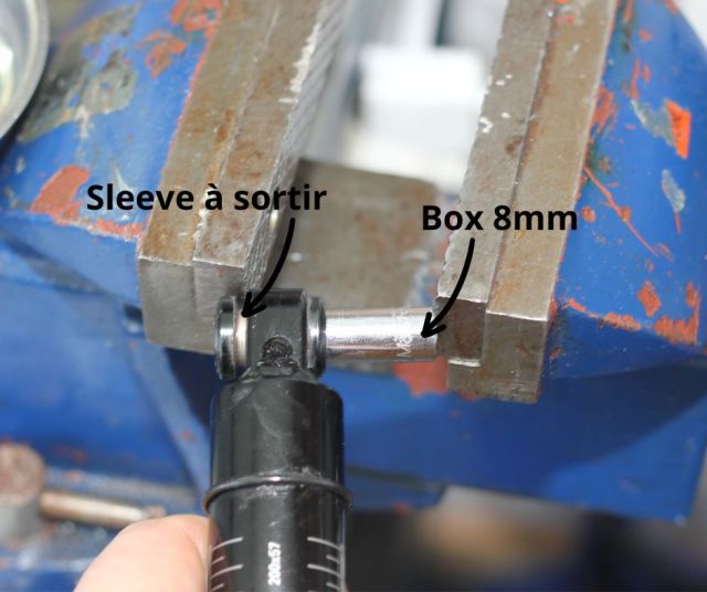 Tu peux utiliser un box 8mm et ton étau (comme dans l’image) pour l’extraire. Si tu as un kit pour sortir des bearings, tu peux aussi t’en servir ici. - Dégonfler le ressort