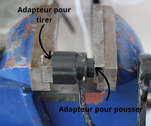 L’objectif c’est de trouver une surface plane et de la couvrir le plus possible avec ton adaptateur. Ça va t’aider à forcer droit. - Installer ta presse et ton bearing en place.