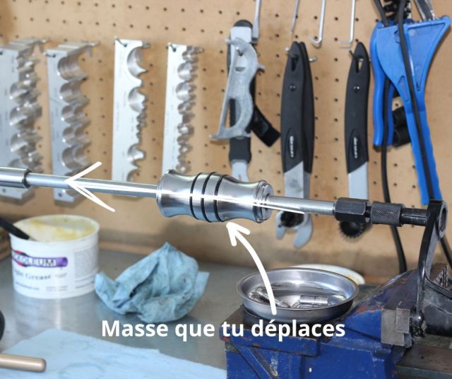 C’est essentiellement une grosse vis avec un poids. Tu veux t’assurer de bien la supporter en vissant pour éviter de déplacer l’adapteur (qu’il reste droit). - Donne des bons coups vers l’extérieur pour sortir le bearing.