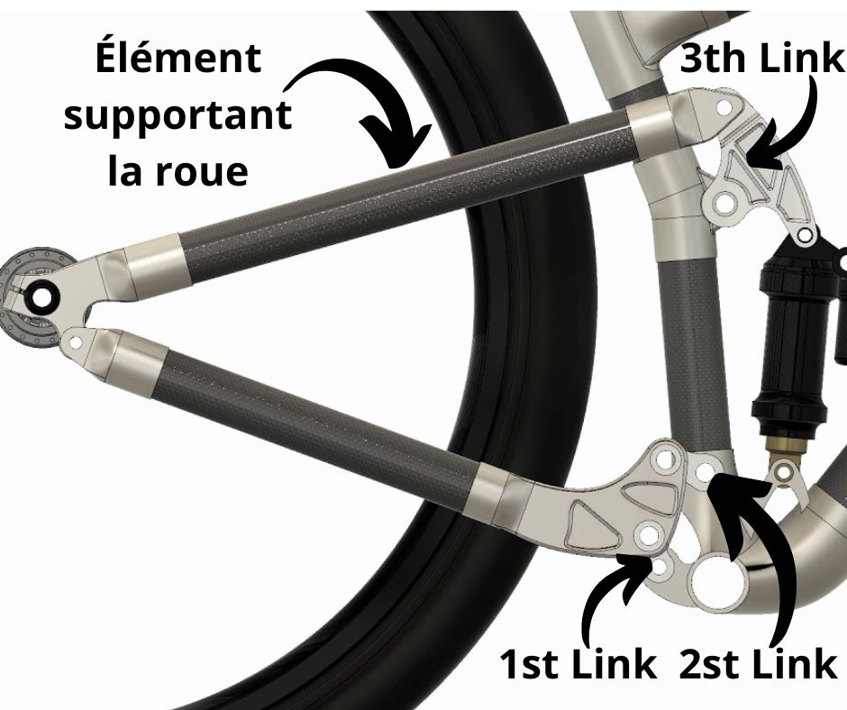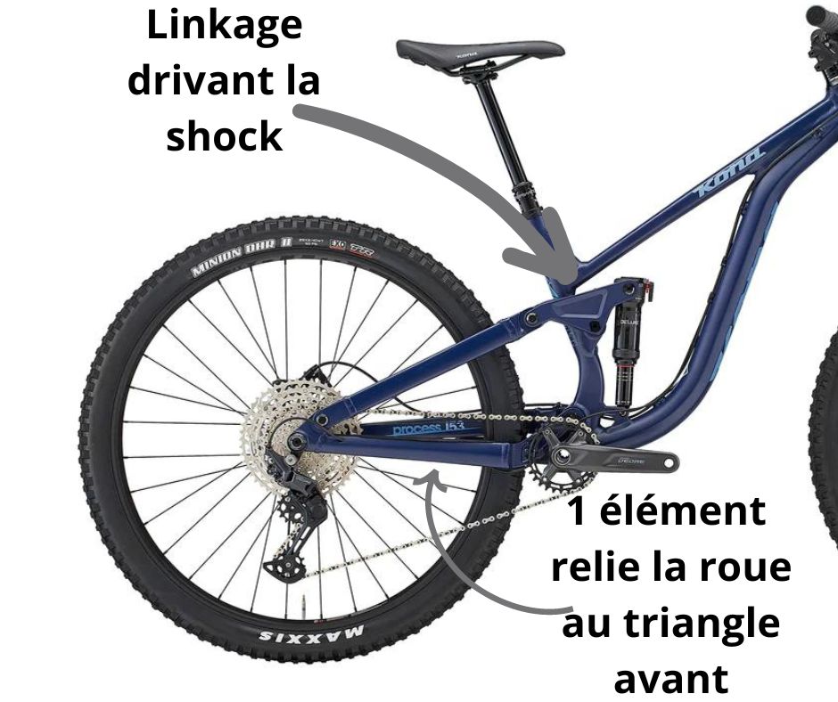 C’est un design plus récent sur le marché qui relie ta roue arrière à ton triangle avant par 3 links différents. Essentiellement, tu rajoutes une nouvelle possibilité de mouvement pour manipuler avec de soin l’anti-squat et l’anti-rise.
