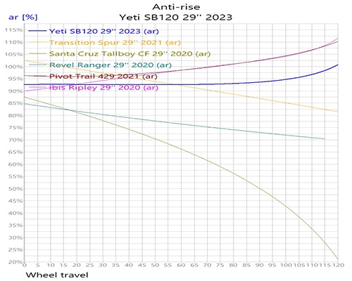 L’anti-rise à aussi tendance à être plus élevé que la moyenne avec un centre de rotation qui part d’autour ton boitier de pédalier pour se situer très loin devant ta roue avant en pleine compression. C’est typiquement le design qui génère les plus gros mouvements de centre de rotation.