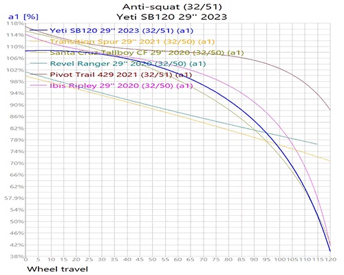 L’anti squat de ton vélo va également varier selon la position où tu te trouves dans ton débattement. Tu veux donc éviter des designs avec des grosses variations autour du point de sagesse: ça rend ton vélo inconstant.
