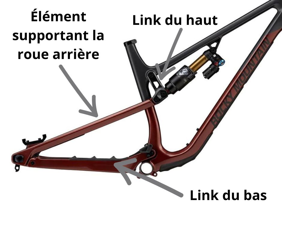 Par exemple: le FSR de Specialized, L’ABP et le DW-Link de Trek et Devinci, Orbea, Norco, Scott, Transition, etc.