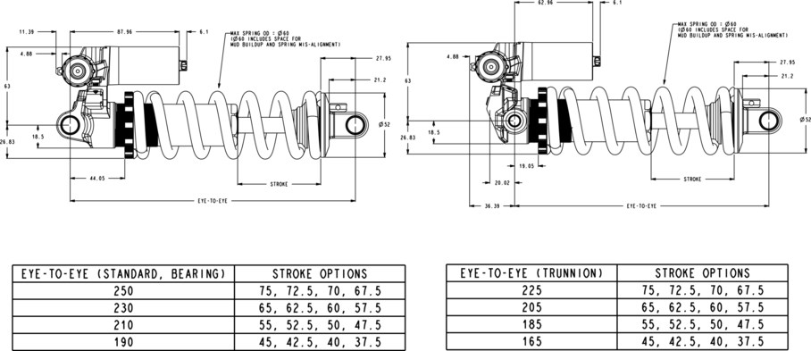 C’est la longueur totale de ta suspension (ex: 190mm, 210mm, 230mm, etc.). Il existe 2 standards de montagne: Trunnion (165, 185, 205 et 225mm) et standard (190, 210, 230 et 250mm). Chaque taille est spécifique à ton bike et tu ne peux pas modifier une shock pour en changer la longueur. - Stroke (débattement)
