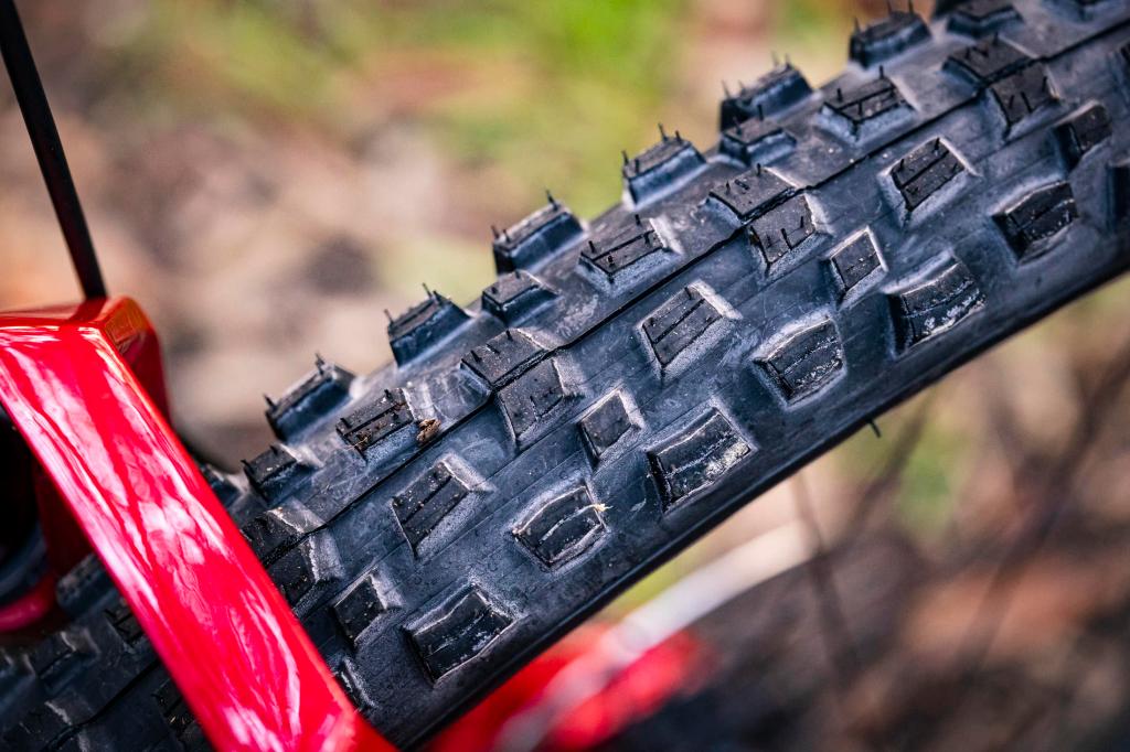 L’objectif étant de créer un bike capable d’en prendre en descente en t’offrant de la confiance et de la traction, le premier arrêt, c’est tes pneus. Voici la clé pour aller chercher de la traction: